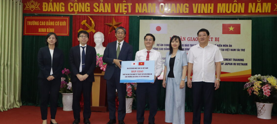 Ngày 03/10/2025, Trường Cao đẳng Cơ giới Ninh Bình và Đại sứ quán Nhật Bản tại Việt Nam long trọng tổ chức Lễ bàn giao thiết bị Dự án “Cung cấp thiết bị đào tạo nghề Kỹ thuật chế biến món ăn cho Trường Cao đẳng Cơ giới Ninh Bình”